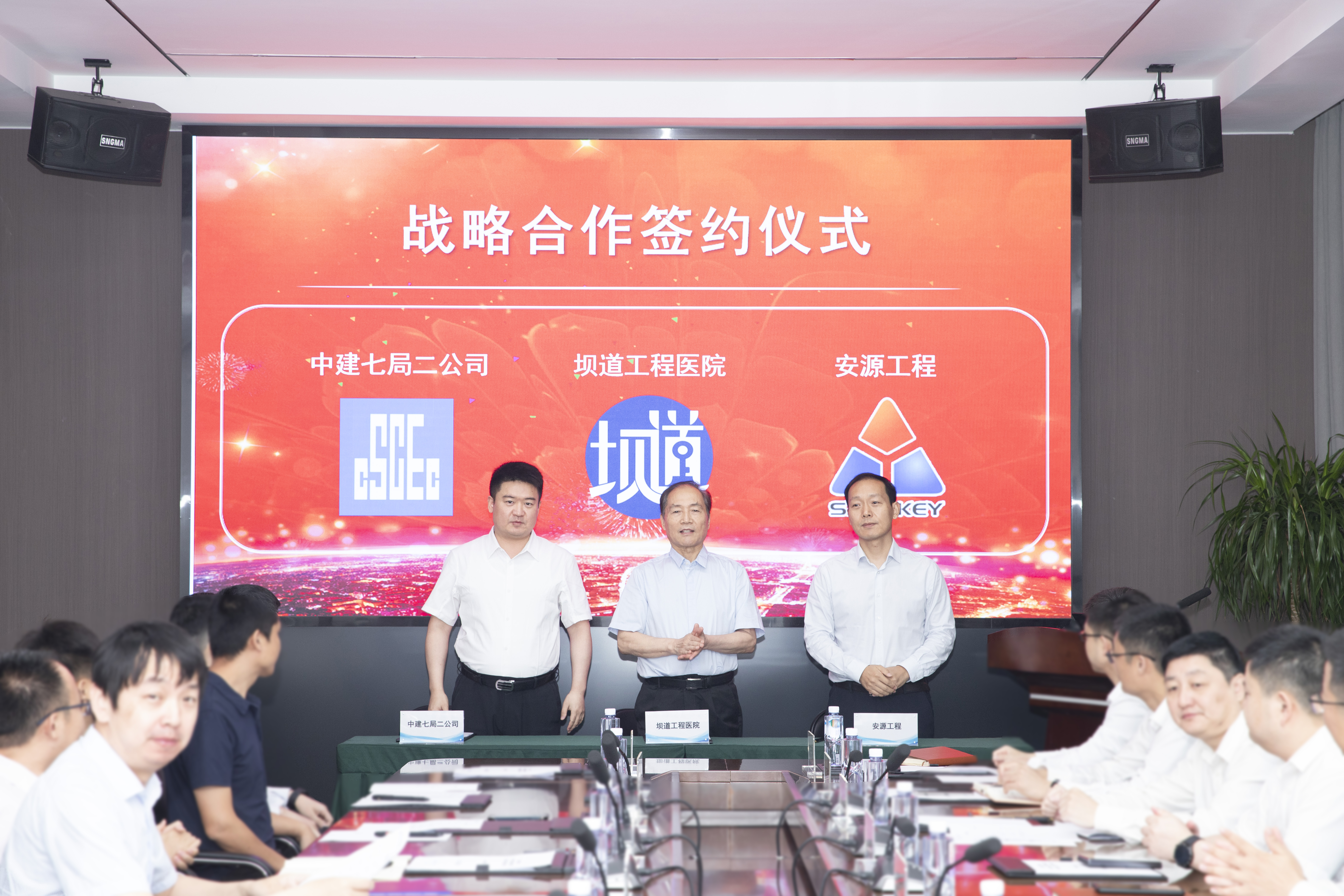 2024年6月16日上午,鄭州安源工程技術有限公司與壩道工程醫院、中建七局第二建筑有限公司在鄭州簽署三方戰略合作協議。中國工程院院士、黃河實驗室(河南)主任、壩道工程醫院院長王復明,黃河實驗室(鄭州大學)執行主任、鄭州大學地下工程研究院執行院長方宏遠,壩道工程醫院執行副院長馮磊、副總工程師潘艷輝,中建七局第二建筑有限公司黨委書記、董事長尚愷喆,黨委副書記、總經理陳海波,鄭州安源工程技術有限公司總經理趙鵬等出席活動。會議由方宏遠主任主持。