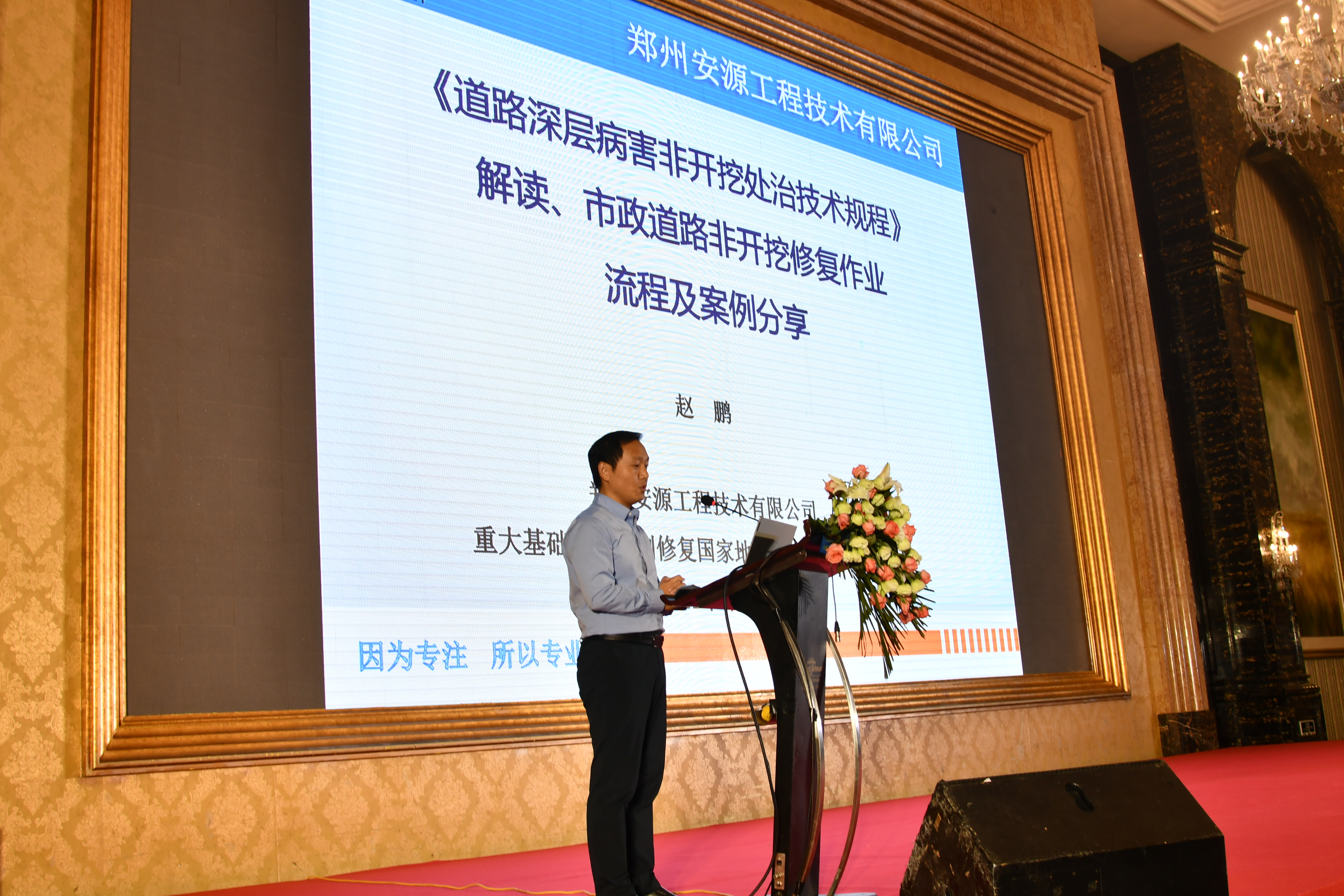 總經理趙鵬在會上作了題為《<道路深層病害非開挖處治技術規程>解讀、市政道路非開挖修復作業流程及案例分享》的主題報告,全面地介紹了安源公司的發展歷程、業務范圍、專利獎項及核心技術,并對由公司編寫的《道路深層病害非開挖處治技術規程》進行講解。他認為,加快道路深層病害非開挖處治新材料、新技術、新裝備的研發與推廣,是當前基礎設施安全防護領域亟待解決的重大科技問題。《規程》的編制,有助于規范工程檢測、設計、施工及驗收,統一技術要求,提高施工質量。趙總經理介紹道,自安源公司成立以來,深耕道路病害處治難題,以水不敏感型高分子聚合物作為修復材料,創新性研發“道路隱蔽病害非開挖快速診治技術”。技術已于全國多地得到應用,修復了唧泥、脫空、裂縫、沉降等道路病害,取得了良好的工程效果和社會評價。