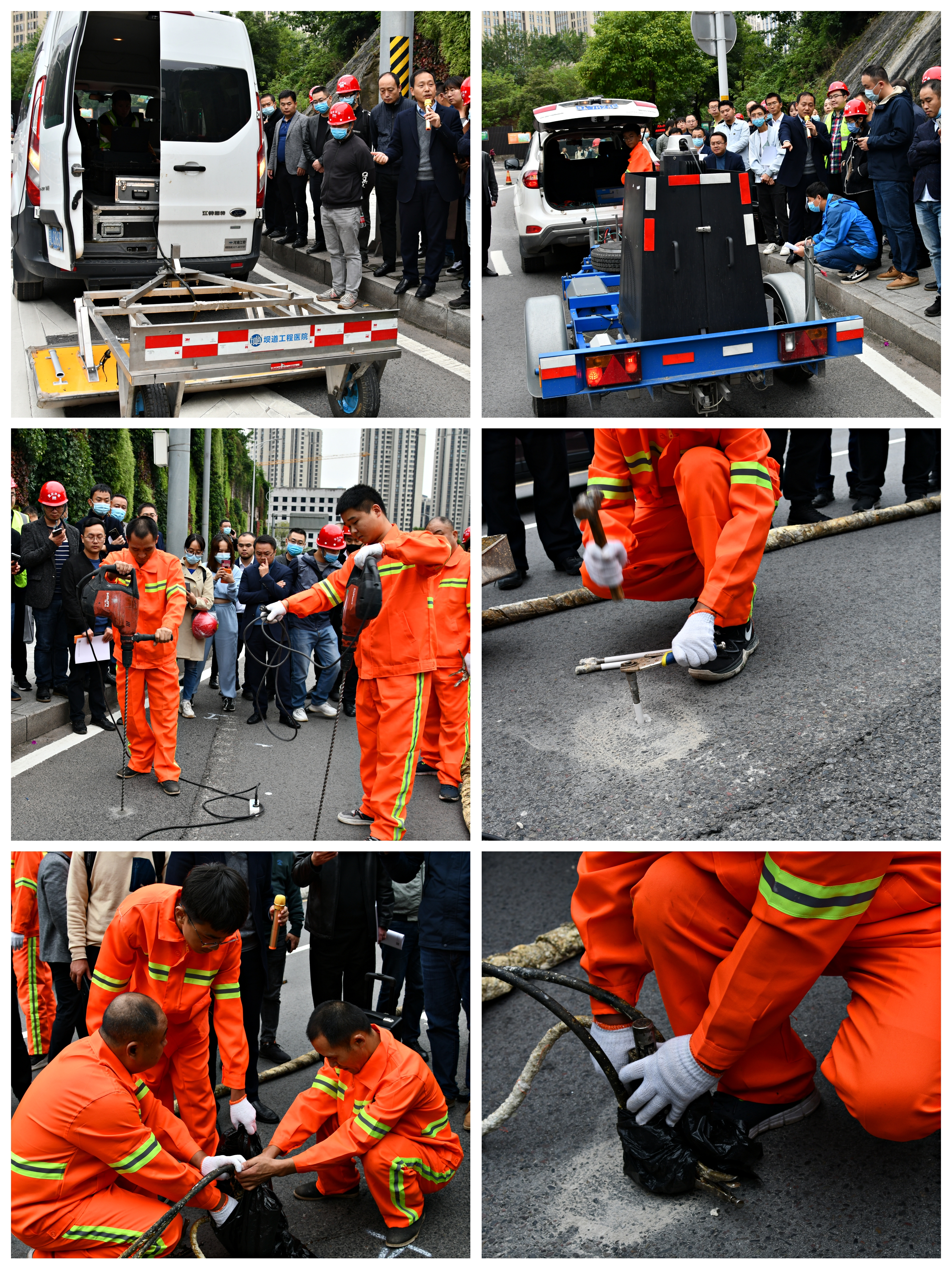 觀摩會(huì)在重慶市渝中區(qū)長(zhǎng)和路與虎踞路交叉口進(jìn)行,七十余名行業(yè)嘉賓現(xiàn)場(chǎng)觀看安源公司運(yùn)用“非開挖快速診治技術(shù)”對(duì)該路段的一處道路脫空進(jìn)行修復(fù)處治,總經(jīng)理趙鵬解說(shuō)施工工藝及核心技術(shù)。他介紹道,“非開挖快速診治技術(shù)”由無(wú)損檢測(cè)設(shè)備和高聚物注漿技術(shù)構(gòu)成,設(shè)備包括三維雷達(dá)、落錘式彎沉儀、集成式高聚物注漿系統(tǒng)等。首先,技術(shù)人員運(yùn)用雷達(dá)找到道路隱蔽病害位置,然后用落錘式彎沉儀進(jìn)行檢測(cè),確定病害程度,再通過(guò)“鉆孔、安裝注漿管、注漿、復(fù)測(cè)、封孔”五步驟,在不破壞路面結(jié)構(gòu)、對(duì)環(huán)境無(wú)污染的前提下,使用高聚物對(duì)空洞進(jìn)行快速填補(bǔ)。在現(xiàn)場(chǎng)嘉賓的共同觀看下,該道路病害僅用半小時(shí)左右就完成處治,脫空得到修復(fù),充分體現(xiàn)了安源公司“非開挖快速診治技術(shù)”具有施工快捷、無(wú)需養(yǎng)生、不破壞路面結(jié)構(gòu)、對(duì)環(huán)境無(wú)污染等優(yōu)點(diǎn),得到了現(xiàn)場(chǎng)嘉賓的一致好評(píng)。