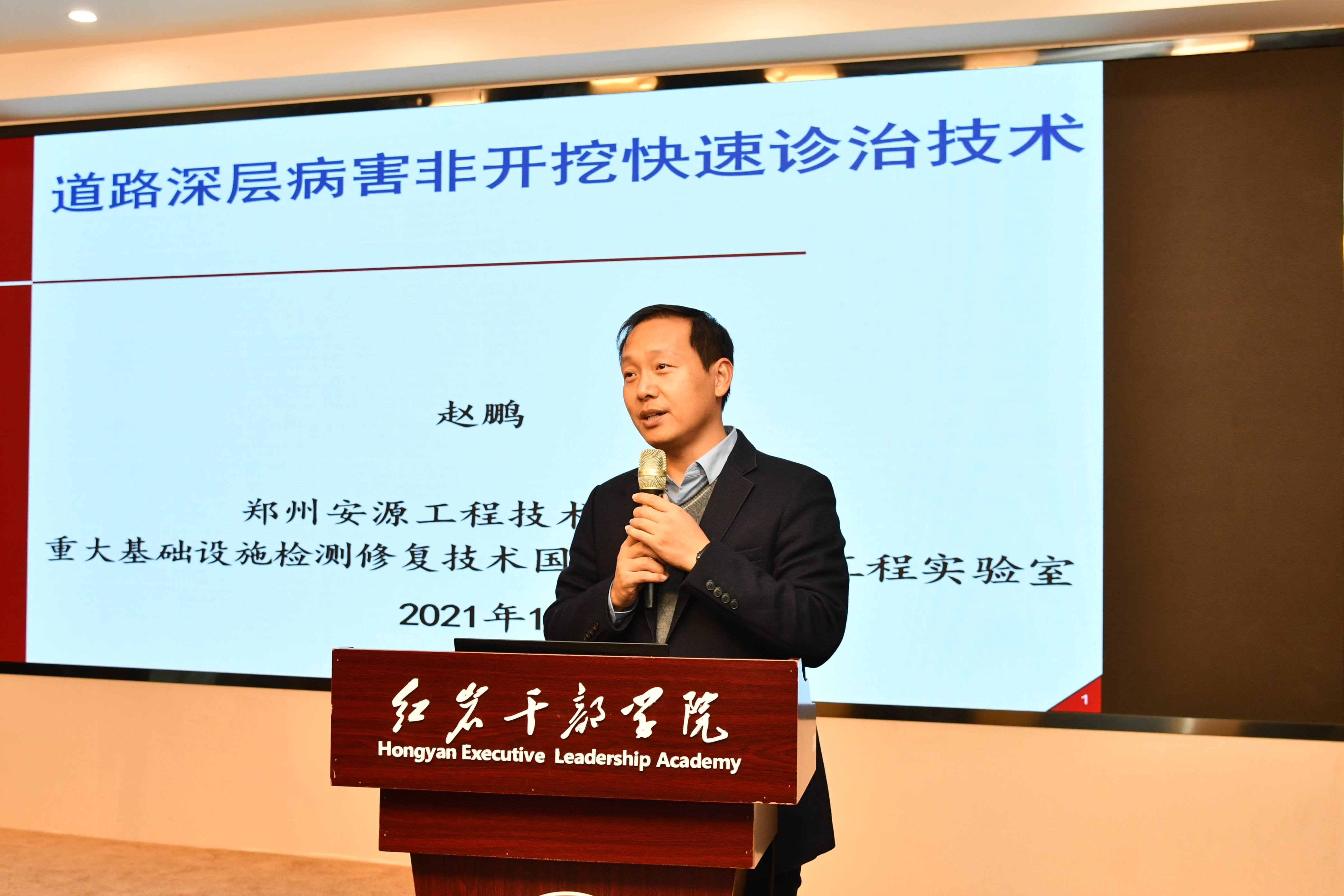 隨后,總經(jīng)理趙鵬在紅巖干部學(xué)院會(huì)議室作題為《道路深層病害非開挖快速診治技術(shù)》的主旨報(bào)告,從傳統(tǒng)維修技術(shù)、非水反應(yīng)高聚物材料及其工程特性、道路非開挖快速維修高聚物注漿技術(shù)等方面展開介紹。他指出,中國(guó)交通基礎(chǔ)設(shè)施建設(shè)發(fā)展迅速,維護(hù)任務(wù)日益繁重,傳統(tǒng)維修技術(shù)已不能滿足需求。道路非開挖快速診治技術(shù)具有環(huán)保、耐久、早強(qiáng)、適應(yīng)性強(qiáng)等特點(diǎn),能實(shí)現(xiàn)精準(zhǔn)診斷、精細(xì)注漿,具有廣闊的應(yīng)用前景。安源公司已運(yùn)用該技術(shù)在多條高速公路、市政道路、機(jī)場(chǎng)道面等工程上完成道路病害修復(fù)工作,并取得一定工程成績(jī)與認(rèn)可。