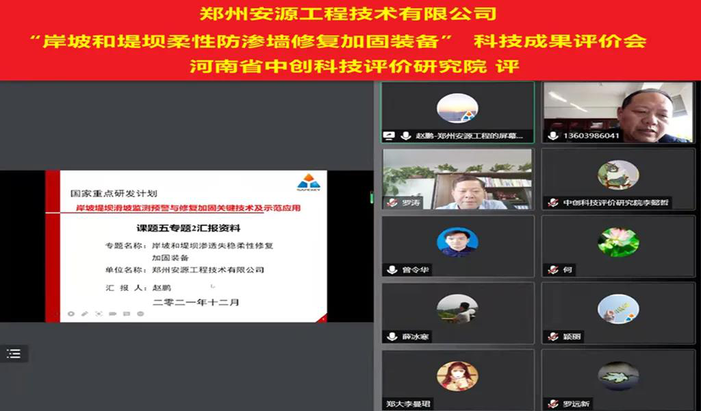 2022年1月12日,河南省中創科技評價研究院依據科技部《科學技術評價辦法》有關規定,對我司完成的“岸坡和堤壩柔性防滲墻修復加固裝備”項目進行了科技成果評價。公司總經理趙鵬作題為《岸坡堤壩滑坡監測預警與修復加固關鍵技術與示范應用》的課題匯報,介紹技術的基本情況及核心技術要點。